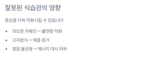 - 과도한 카페인 섭취: 불면증, 안면홍조 악화