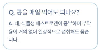 A. 네, 콩은 식물성 에스트로겐이 풍부하며 부작용이 거의 없어 일상적으로 섭취해도 좋습니다.
