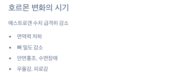이 시기에는 면역력 저하, 뼈 밀도 감소, 우울감, 안면홍조, 수면장애 등이 흔히 나타나며, 식이요법을 통해 증상을 완화하고 신체 균형을 회복하는 것이 매우 중요합니다.