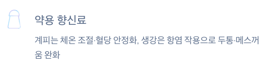 - 생강: 항염 작용, 갱년기 두통, 메스꺼움 완화