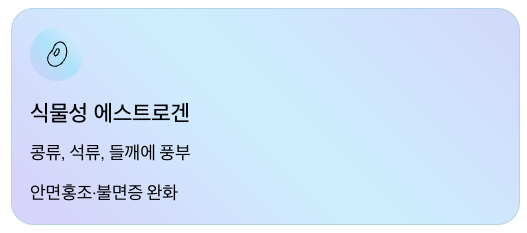 콩에는 **식물성 에스트로겐(이소플라본)**이 풍부해, 에스트로겐 수치 감소로 인한 증상을 완화하는 데 효과적입니다. 특히 청국장은 발효식품으로 장 건강에도 도움을 줍니다.