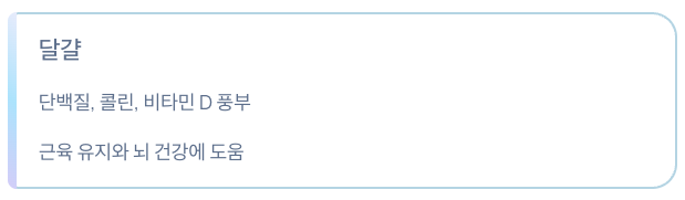 단백질, 콜린, 비타민 D가 풍부해 근육 유지, 뇌 건강에 도움이 됩니다. 단, 과다 섭취는 주의.