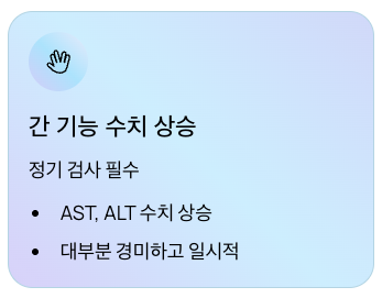 - 대부분 경미하고 일시적이나, 정기적인 간 기능 검사 필수