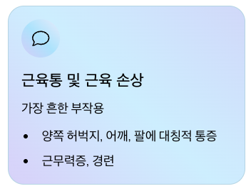 가장 흔히 보고되는 부작용 중 하나는 근육통, 경련, 근무력증입니다.