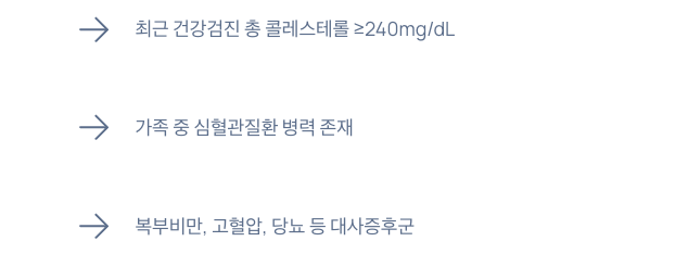 - 최근 건강검진에서 총 콜레스테롤 ≥ 240mg/dL