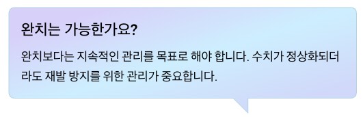 A. 완치보다는 지속적인 관리를 목표로 해야 합니다. 수치가 정상화되더라도 재발 방지를 위한 관리가 중요합니다.