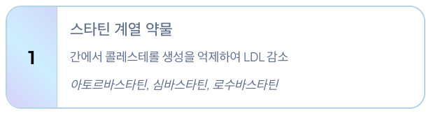 - 약물 예시: 아토르바스타틴, 심바스타틴, 로수바스타틴 등