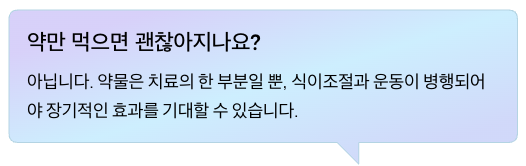 A. 아닙니다. 약물은 치료의 한 부분일 뿐, 식이조절과 운동이 병행되어야 장기적인 효과를 기대할 수 있습니다.