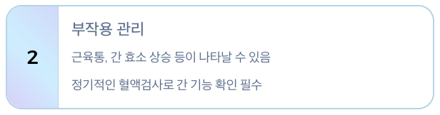 - 정기적인 혈액검사를 통해 간 기능, CK 수치 확인 필수