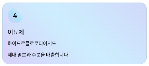 • 기전: 체내 염분과 수분 배출 → 혈압 하강