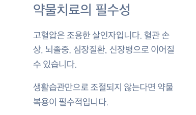 고혈압은 혈관 손상, 뇌졸중, 심장질환, 신장병 등의 합병증으로 이어질 수 있는 만성질환입니다.
