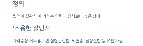고혈압(Hypertension)은 혈액이 혈관을 지나갈 때 벽에 가하는 압력이 정상보다 높은 상태를 말합니다.