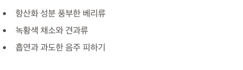 - 항산화 성분이 풍부한 음식(베리류, 녹황색 채소, 견과류) 섭취
