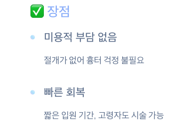 | 회복 기간 | 상대적으로 짧음 | 수술 후 회복 기간 필요 |