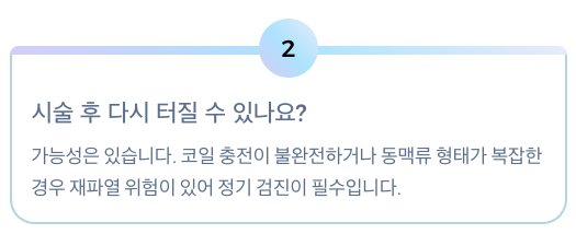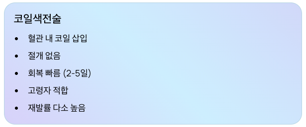 🕒 시술 시간은 평균 1.5~3시간이며, 동맥류 위치와 환자 상태에 따라 달라집니다.