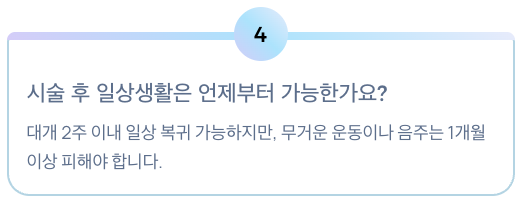 A. 대개 2주 이내 일상 복귀 가능하지만, 무거운 운동이나 음주는 1개월 이상 피해야 합니다.