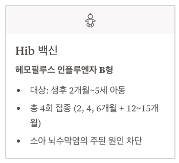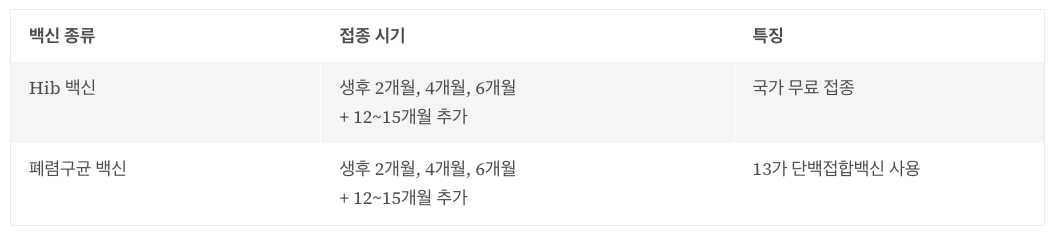 | Hib 백신 | 생후 2, 4, 6개월 + 12~15개월 추가 | 국가 무료 |