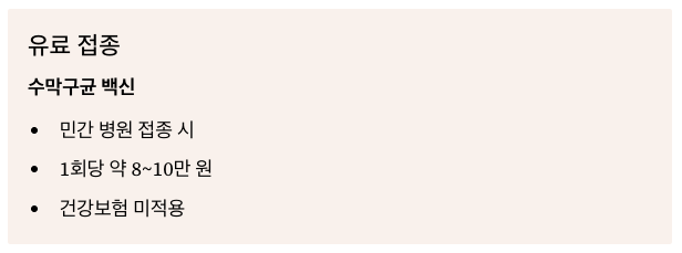 - 민간 병원에서 수막구균 백신 접종 시 약 8~10만 원 소요