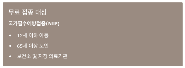 - 국가필수예방접종(NIP): 12세 이하 아동 및 65세 이상 무료