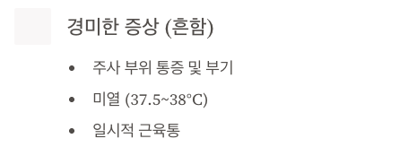 - 경미한 부작용: 주사 부위 통증, 발열, 근육통