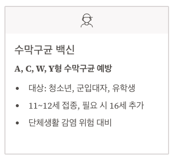 - 수막구균 백신: 군입대 전, 해외 유학 전