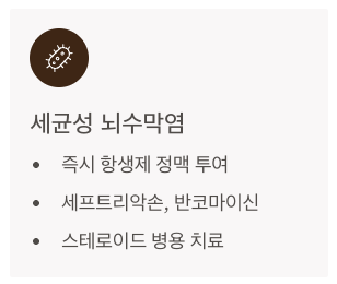 - 일반적으로 세프트리악손, 반코마이신 등의 광범위 항생제 사용