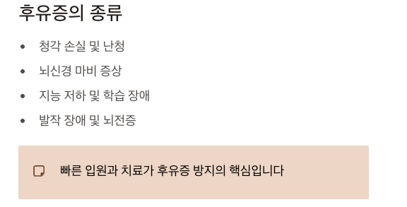 - 청력 저하 검사 필수, 소아는 언어 발달 관찰
