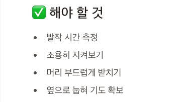 - 발작 후에는 혼란스럽거나 피로한 상태가 되므로 조용히 안정을 취할 수 있도록 합니다.