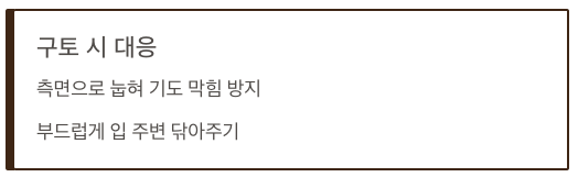 - 가능한 한 몸을 옆으로 돌려 기도 확보를 도와주세요.
