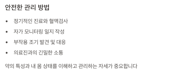 정기적인 진료와 혈액검사, 자가 모니터링 일지 작성 등으로 부작용을 조기에 발견하고 대응해야 안전한 치료가 가능합니다.