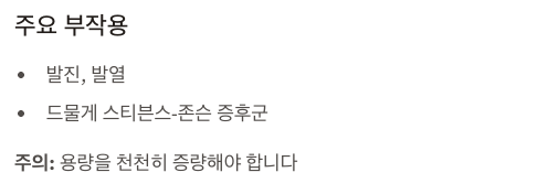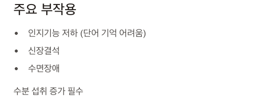 • 주의사항: 용량을 천천히 증량해야 부작용 위험 감소