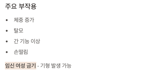 • 부작용: 체중 증가, 탈모, 간 기능 이상, 손떨림