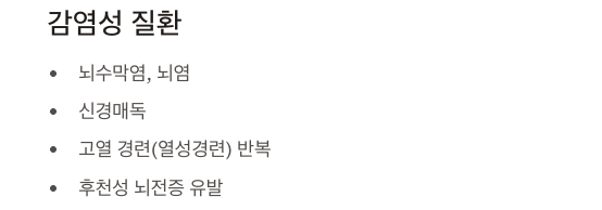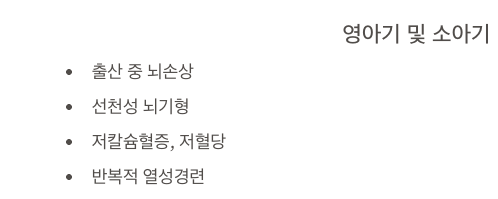 - 출산 중 뇌손상, 선천성 뇌기형, 대사성 질환