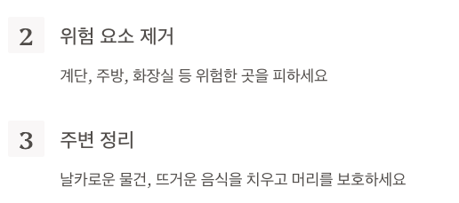 • 날카로운 물건, 뜨거운 음식 등은 즉시 치우고 머리를 보호할 수 있는 환경을 마련해야 합니다