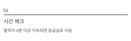 - 시간을 측정하여 발작이 5분 이상 지속되면 응급실로 이송해야 합니다.