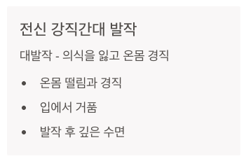 - 흔히 말하는 대발작으로, 의식을 잃고 온몸이 경직 및 떨림 증상을 보입니다.