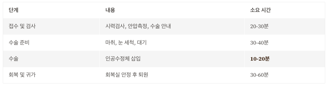 | 수술 준비 | 마취, 눈 세척, 대기 | 30~40분 |