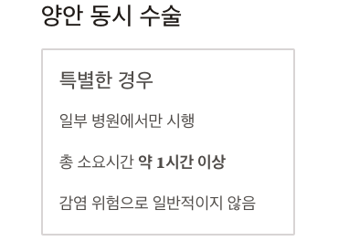 대부분의 경우 양쪽 눈은 시간 차를 두고 수술합니다. 이는 회복 상황을 살펴보기 위함이며, 양안 동시 수술은 일부 병원에서만 시행되며 총 소요시간은 약 1시간 이상이 소요됩니다. 다만, 양안 동시 수술은 감염 위험 때문에 일반적이지 않습니다.