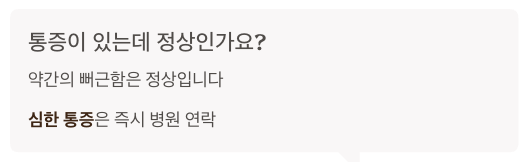 A. 약간의 뻐근함은 정상이나, 통증이 심하다면 염증 가능성이 있으므로 병원에 연락하세요.