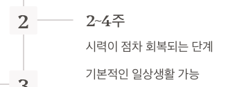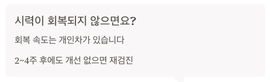 - 2~4주: 시력 점차 회복, 일상생활 가능
