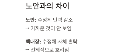 많은 사람들이 백내장과 노안을 혼동합니다. 노안은 수정체의 탄력성이 감소하여 가까운 것이 잘 보이지 않는 상태이며, 백내장은 수정체 자체가 혼탁해지는 질환입니다. 두 증상은 비슷하게 시작되지만, 원인과 치료법이 다르므로 정확한 구분이 필요합니다.
