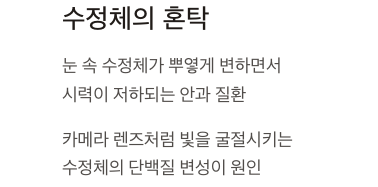 백내장은 눈의 수정체가 혼탁해져 시력이 저하되는 대표적인 안과 질환입니다. 수정체는 카메라의 렌즈처럼 눈 속에서 빛을 굴절시켜 망막에 선명한 영상을 맺게 하는 역할을 합니다. 그러나 나이가 들면서 단백질이 변성되면 이 수정체가 점점 뿌옇게 변하면서 시야가 흐릿해지는 증상이 나타납니다.