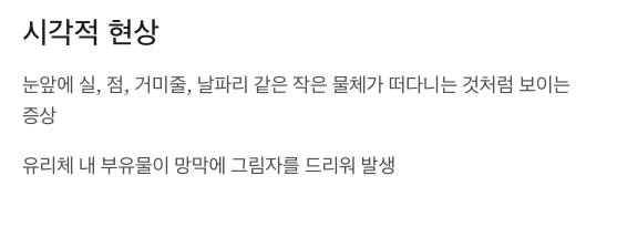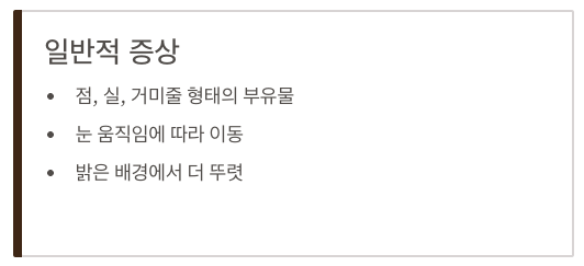 눈을 움직일 때 따라다니는 부유물이 보이며, 모양과 수는 다양합니다.