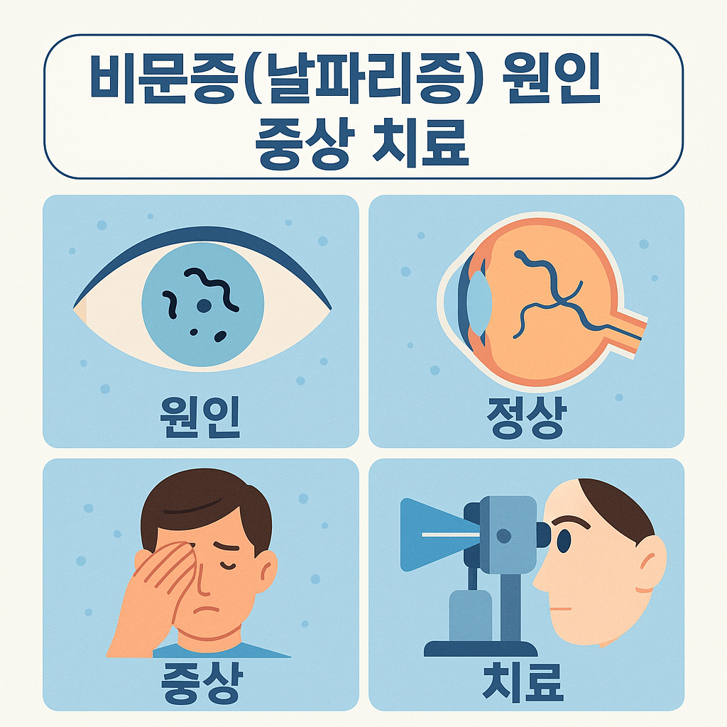 비문증은 눈앞에 마치 실, 점, 거미줄, 날파리처럼 작은 물체들이 떠다니는 것처럼 보이는 시각적 현상을 말합니다. 대부분은 눈 속 유리체의 변화로 인해 생기며, 흔히 ‘날파리증’이라는 이름으로 불립니다.
