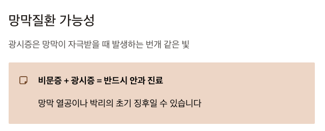 광시증은 망막이 자극받을 때 발생하는 증상으로, 번개처럼 번쩍이는 빛이 보입니다.