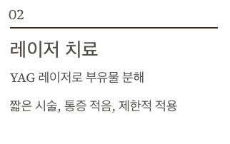 - YAG 레이저로 부유물을 분해하여 시야에서 사라지게 하는 치료입니다.