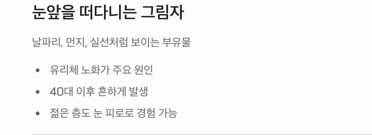 A. 네. 40대 이후 유리체가 변성되며 흔히 나타납니다. 그러나 젊은 층에서도 스트레스, 눈 피로, 스마트폰 과다 사용 등으로 발생할 수 있습니다.