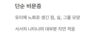 • 단순 비문증: 유리체 변성으로 생긴 점, 실, 그물 모양 부유물이 서서히 생김