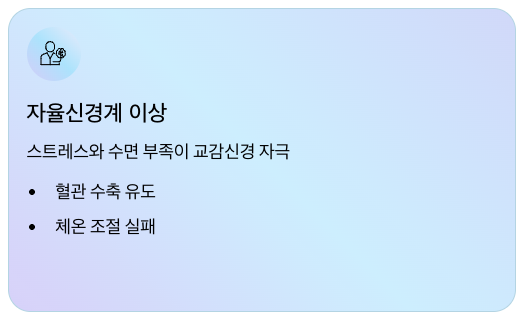 스트레스나 수면 부족은 교감신경을 자극해 혈관 수축을 유도하고, 이로 인해 수족냉증이 발생할 수 있습니다.