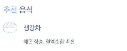 - 따뜻한 성질의 음식 섭취 (생강차, 계피차, 대추차 등)